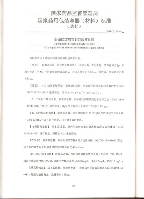 YBB00282002低硼硅玻璃管制口服液體瓶標注(試行)