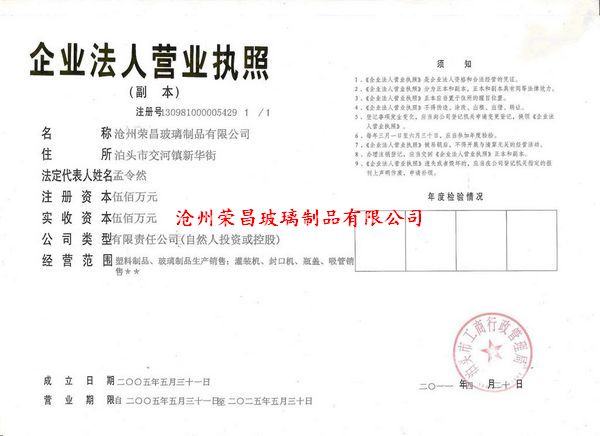 我公司全稱滄州榮昌玻璃制品有限公司,始建于1985,公司注冊(cè)資金500萬(wàn)元,坐落于河北省省級(jí)開發(fā)區(qū)-泊頭市開發(fā)區(qū),是滄州地區(qū)唯一在省級(jí)開發(fā)區(qū)建廠的玻璃制品企業(yè),公司占地面積50余畝,標(biāo)準(zhǔn)化廠房15000平方米?,F(xiàn)有員工300余人,其中工程技術(shù)人員210人。