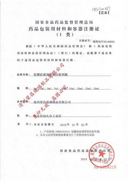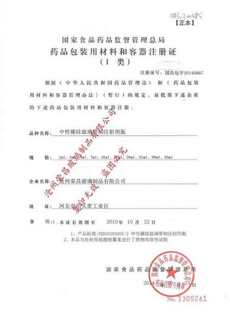 我公司全稱滄州榮昌玻璃制品有限公司,始建于1985年,公司注冊資金500萬元,坐落于河北省省級開發區-泊頭市開發區,是滄州泊頭市地區唯一一家具有國家食品藥品監督管理局頒發的“藥品包裝用材料和容器注冊證” 的企業,擁有多個藥包材證書。