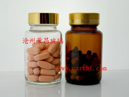 保健品玻璃瓶,藥用食品級別,完全符合國家食品藥品監督管理局YBB00272002標準,顏色有棕色,無色透明、藍色和綠色,配套高檔電化鋁蓋,玻璃瓶和鋁蓋可以印刷logo,燙金處理等。