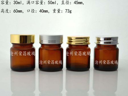 30ml棕色廣口玻璃瓶,適用于承裝各種片劑,膠囊,膏劑等,瓶型美觀大方,搭配高檔鋁蓋。標稱容量:30ml,滿口容量:50ml,直徑:45mm,高度:60mm,口徑:40ml,重量:73g。