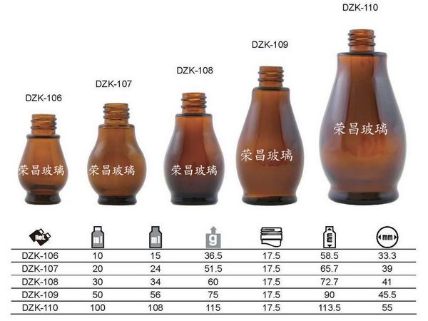 棕色葫蘆精油瓶采用優質鈉鈣藥用玻璃生產,適用于盛裝各種藥品或者化妝品類產品,規格有5ml、10ml、20ml、30ml、50ml、100ml,可以搭配各種電化鋁蓋和塑料蓋。瓶型有兩款,單葫蘆玻璃瓶和單葫蘆玻璃瓶瓶兩種。