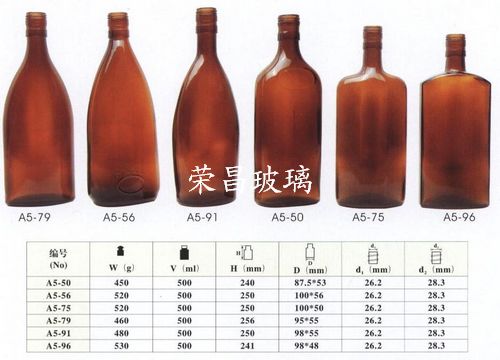 我公司玻璃酒瓶包括以下品種:棕色酒瓶,棕色白酒瓶,棕色洋酒瓶,棕色黃酒瓶,棕色藥酒瓶,棕色葡萄酒瓶等,規格和瓶型多樣,玻璃瓶模具有100余個。